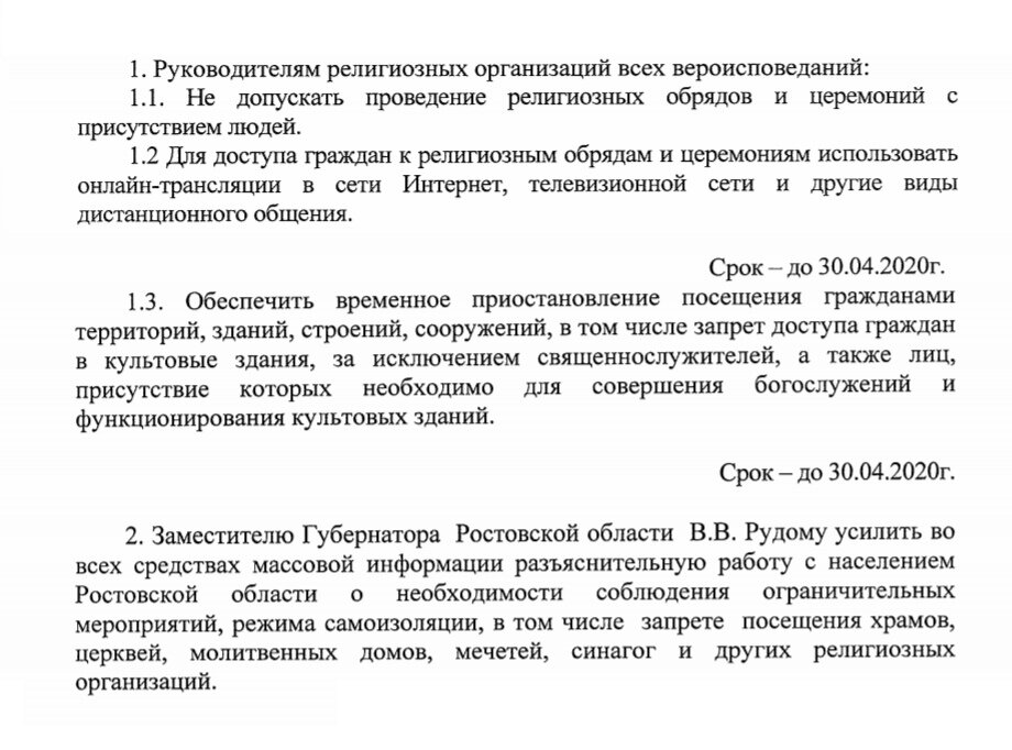 Главный государственный санитарный врач региона Евгений Ковалев, вчера, 11 апреля, подписал постановление «Об усилении ограничительных мероприятий», в котором прописан временный запрет на посещений культовых зданий для отправления религиозных нужд. Запрет не касется тех кто должен поддерживать здания в рабочем состоянии (служителей церквей). Вместо посещения храмов предлагается вести трансляции служений в интернете. Источник: Роспотребнадзор Ростовской области