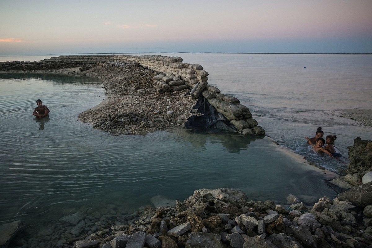 Выше: дети, играющие в воде возле дамбы в деревне Тебикеникура, одном из островов, наиболее пострадавших от повышения уровня моря в районе Кирибати. Деревня регулярно затопляется во время высоких приливов, несмотря на попытки жителей построить морские стены или заботиться о тех, которые были построены местным правительством, но частые большие волны продолжают повреждать их, ставя дома и сады жителей под постоянную угрозу. (Южная Тарава, Кирибати)