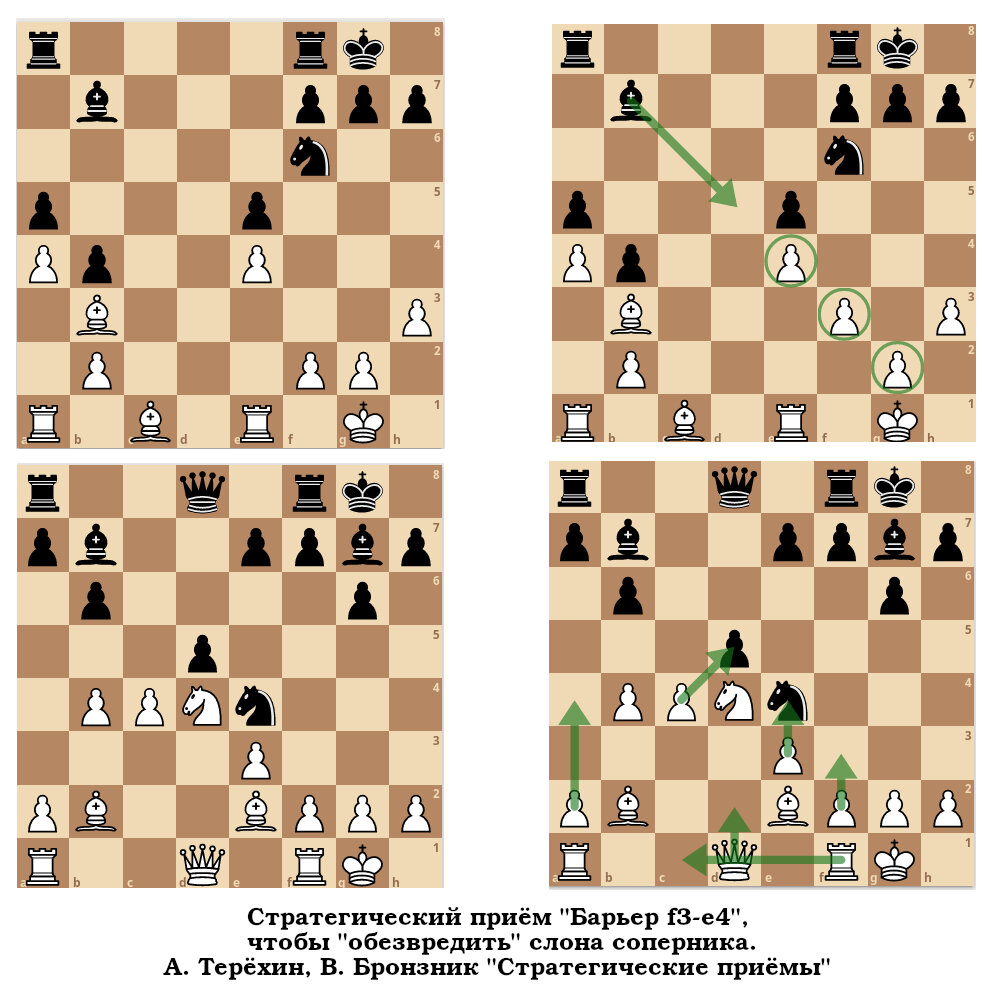 Ещё один интересный стратегический приём в шахматах, который не сразу бросится в глаза. Помогает сделать слона соперника менее активным. Открывает королю дорогу в центр, что полезно для эндшпиля. Создаёт целостную пешечную структуру. Позиция №1, план игры белых: f3-Ce3-Лed1-Лac1. Позиция №2, план игры белых: f3-cd-e4-Фd2-Лd1-a4