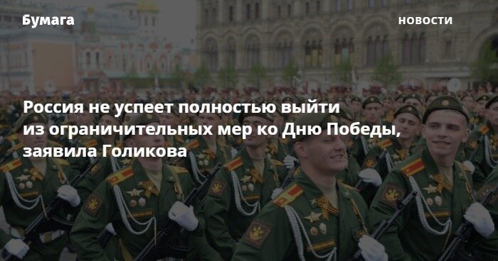 Вице-премьер Татьяна Голикова заявила, что Россия не сможет полностью выйти из всех ограничений по коронавирусу ко Дню Победы.