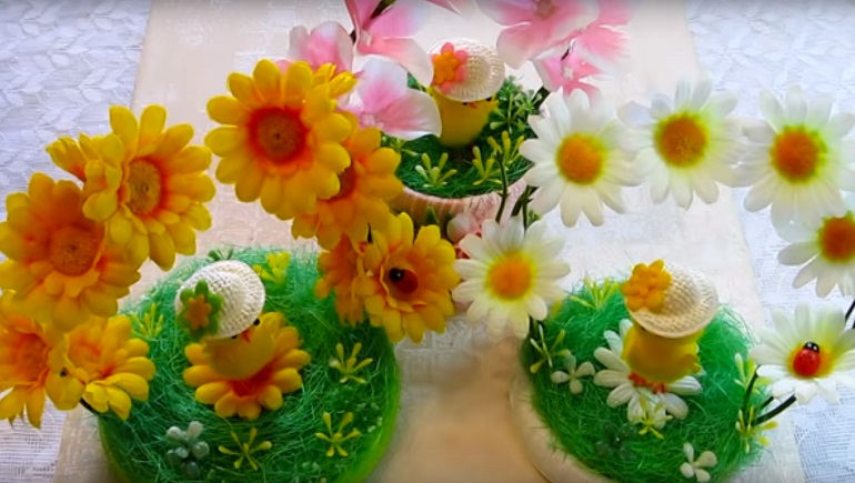 - Начинаем декорирование. Можно посадить искусственного небольшого цыпленка, или еще несколько цветочков. В общем, украсить на свой вкус. Композиция готова.