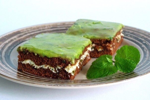 Ингредиенты: Тесто: Яйца – 2 шт. Сахар – 160 г Сливочное масло – 80 г Какао-порошок – 3 ст.л. Мука – 120 г + добавить по щепотке соли и разрыхлителя Ванильная эссенция – 1/2 ч.л. Начинка: Обезжиренный мягкий творог – 200 г Сахар — 40 г Мята — листья с 6-7 веточек Сахарная глазурь: Сахарная пудра — 140 г Молоко — 2-3 ст.л. Мята — листья с 3-4 веточек Несколько капель зеленого пищевого красителя Приготовление: 1. Квадратную 20-сантметровую форму для кекса застелить пергаментной бумагой и слегка смазать маслом. Духовку разогреть до 175градС. 2. Взбить яйца и сахар до светлой пышной массы. 3. Растопить сливочное масло (в микроволновке или в сотейнике на огне) и размешать его с какао-порошком. 4. Добавить шоколадную смесь к яичной и всё вместе взбить. 5. Всыпать просеянную муку с разрыхлителем и солью. Взбить миксером до однородности. 6. Для приготовления начинки мяту перемолоть в блендере или мелко-мелко нарезать ножом. 7. Смешать творог с сахаром, мятой и ванильной эссенцией. 8. Вылит