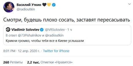 Спортивный журналист Василий Уткин продолжил полемику с телеведущим Владимиром Соловьевым. Уткин сегодня ответил Соловьеву, назвавшему его больным: «Мне не интересно мнение педерастической обезьяны. Если правительство меня предает, я буду говорить». «Крикни громко, чтобы тебя все в Киеве услышали», – написал Соловьев, отвечая Уткину и другому пользователю. «Смотри, будешь плохо сосать, заставят пересасывать», – парировал Уткин.