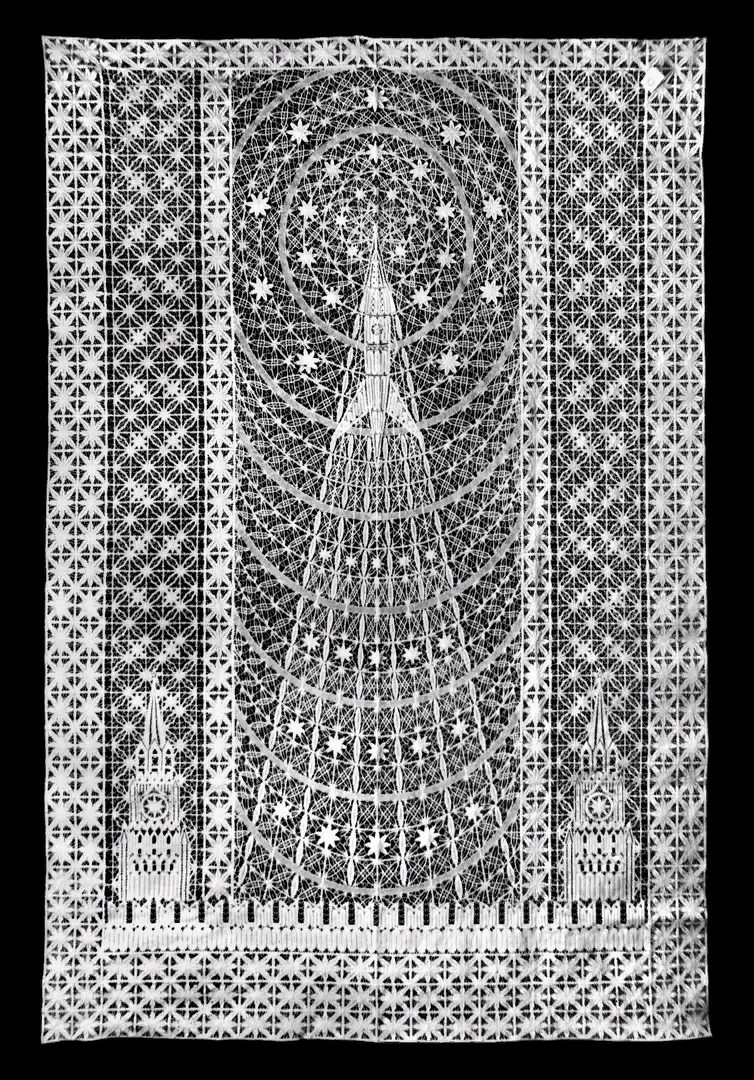 Вологодский музей-заповедник поздравляет вологжан с праздником. Перед вами - занавес кружевной "Спутник" (1960 г) и панно "Космос" (1970). Автор - Анна Антоновна Кораблёва, Вологда.