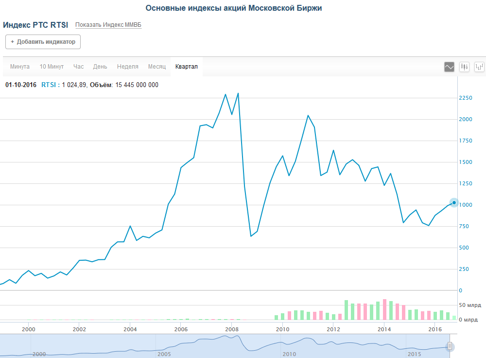 Абсолютное значение индекса обычно не имеет значения, важно лишь его изменение во времени. На начало 2016 года значение РТС составляло 749,28, и это значит, что за прошедший год российский рынок акций вырос на 40%.