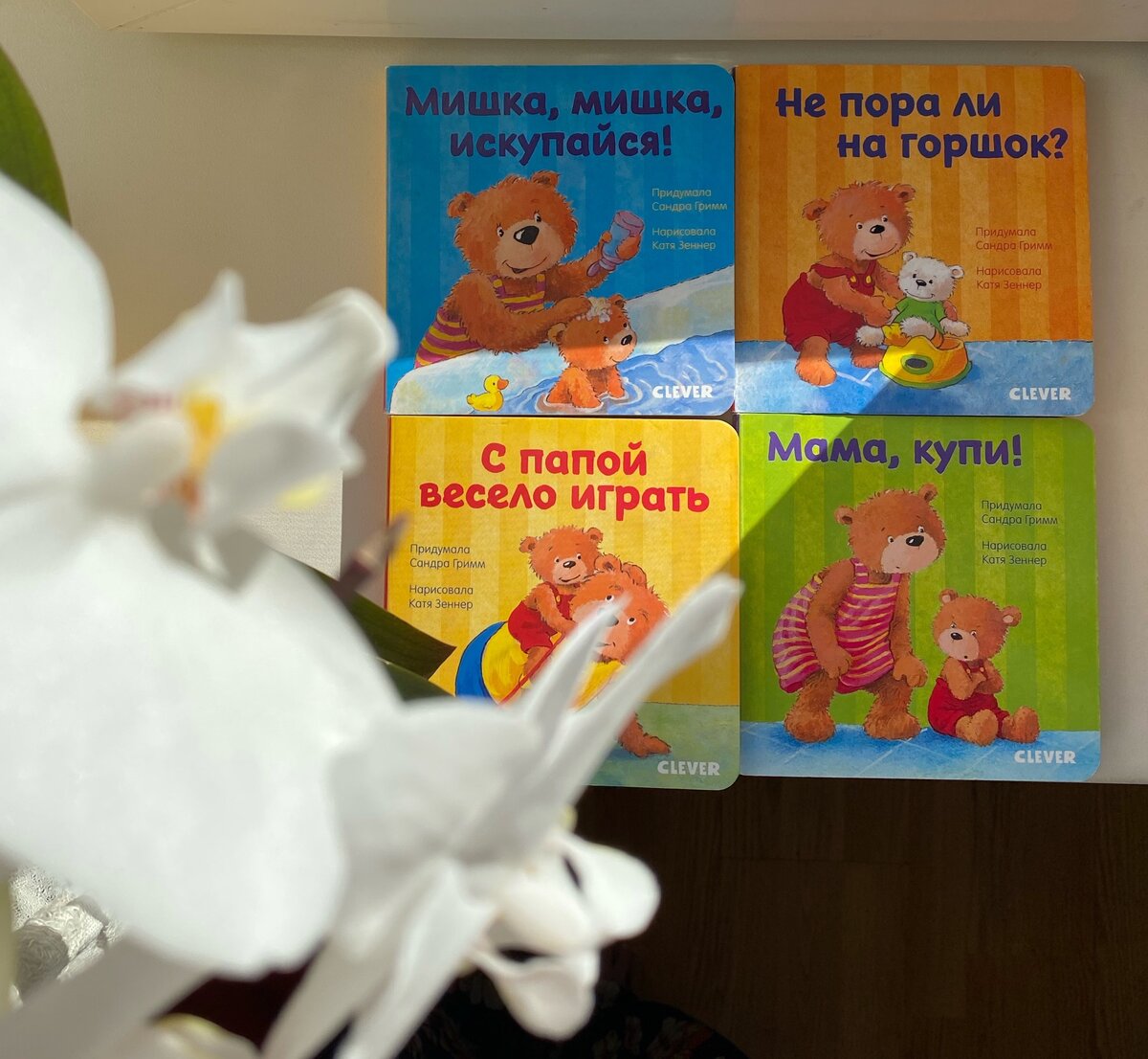 Малыши любят не только волшебные сказки о невиданных мирах, но и истории о повседневности. Давно купила все четыре книги Сандры Гримм о медвежонке Пауле издательства Clever (есть еще крольчонок Пауль у Редакции Вилли Винки, не путать!): ▫️Мама, купи! ▫️С папой весело играть! ▫️Не пора ли на горшок? ▫️Мишка, мишка, искупайся! Книжечки не большие, на плотном глянцевом картоне (слюни не страшны!), в крепком переплете. За три месяца ежедневного чтения следов использования почти незаметно. Купила всю серию сразу, когда Леве было месяцев семь. Почти до 1.1 они стояли на полке нетронутые и вдруг внезапно выстрелили. Каждая книжица – небольшая история, в которой на наш взрослый взгляд совсем ничего не происходит. Мишка требует у мамы в магазине мороженое и продавец хитро его успокаивает. Мишка пробует пописать в горшок. Мишка купается в ванной. Но малышам такое очень нравится, для них любое действие - событие. Купаясь в ванной, можно наливать маме ‘чашечку чая’, на горшок сажать своего л