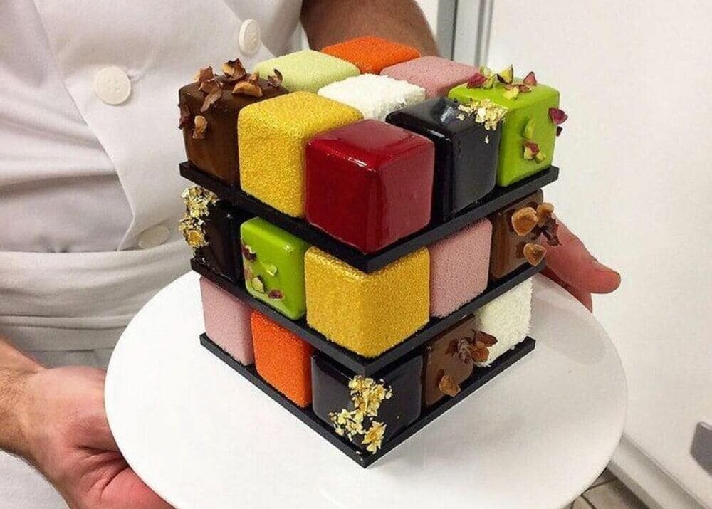Нужна ностальгия! Но не по «трубочке» же с «газировкой». Седрик Гроле специально для таких людей отступил от своей фирменной фишки – делать лёгкие десерты-пирожные из фруктов в форме... самих фруктов. Седрик Гроле вспомнил о самой культовой игрушке детей «поколения миллениум». Конечно же – это кубик Рубика!