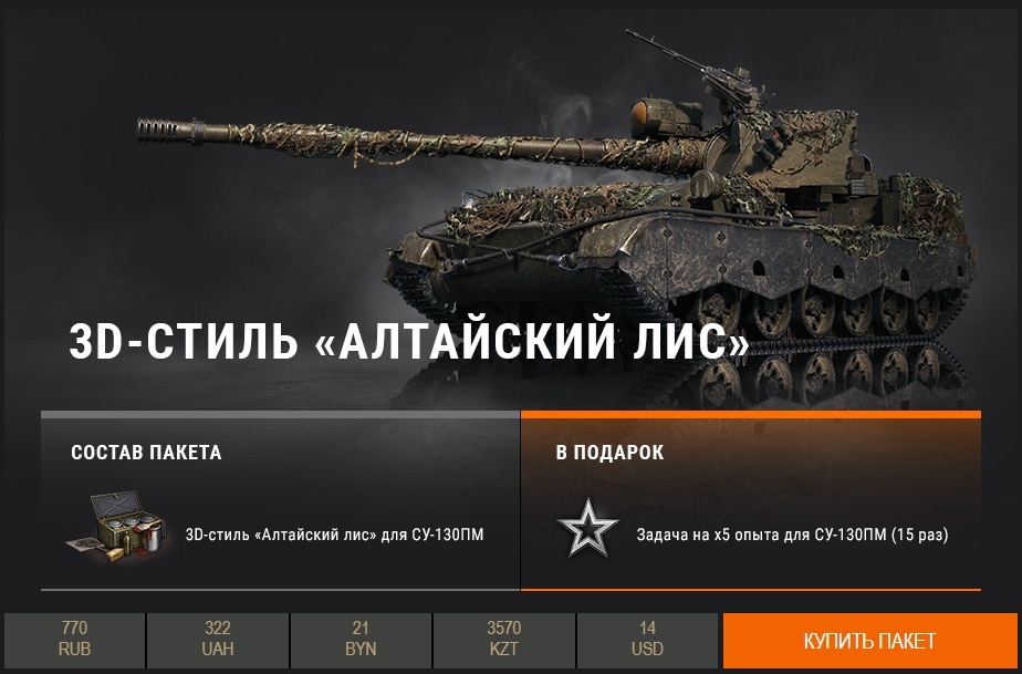 В предложениях этой недели — уникальный 3D-стиль «Алтайский лис», впервые доступный в Премиум магазине! Вы можете приобрести стиль как в отдельном пакете, так и в наборах с: • СУ-130ПМ — советской ПТ-САУ с отличной маскировкой и «альфой» в 520 единиц; • личными резервами на кредиты; • а также золотом и другим игровым имуществом. «Алтайский лис» к охоте готов! * Стиль историчный, нанести его можно только на СУ-130ПМ. ** Наборы доступны с 13 апреля 12:00 (МСК) по 20 апреля 9:00 (МСК).