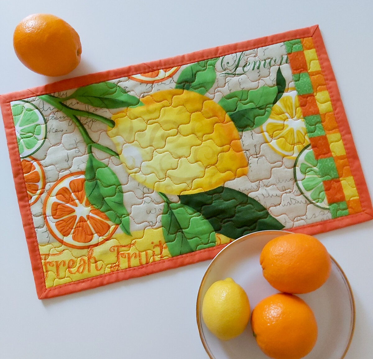 Ну что, все домашние дела переделали? Все шкафчики разобрали, окошки помыли, шторки постирали и повесили? Хочется творчества? Я вас понимаю. Есть у меня для вас одна классная идея для кухни! Нет, мы не будем ничего готовить. Но рецепт приготовления чего-то красивого и утилитарного из лоскутков будет. Щепотка внимания, столовая ложка ярких красок, несколько граммов красивых ниток – перемешать, но не взбалтывать. Как видите, все очень просто! Сегодня в швейному меню - ланч-мат. По названию, вы наверное, уже догадались, что это что-то связано с ланчем, а значит, едой. Так и есть. Ланч-маты - популярная форма лоскутного изделия у мастериц. Их шьют в разных техниках и из разных тканей. Используют как салфетку на стол под тарелки и столовые приборы. Мы сошьем витаминный ланч-мат. Из 1 панели получим сразу 4 подставки для всей семьи. Для шитья четырех ланч-матов нам понадобятся: - 1 Панель CITRUS GROVE 25485 BLU1 (250 руб); - ткани-компаньоны для бейки (например, универсальные ткани колле