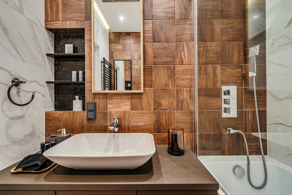 Разберем тренды дизайна ванной комнаты в 2020. Отделка плиткой. Одна из фишек 2019-2020 годов в идеях дизайна это максимально экологичные материалы и натуральность, поэтому выбирайте отделку с фактурой дерева. Современная плитка отлично имитирует массив дерева и передает глубину рисунка. Такую плитку можно мастерски скомбинировать с плиткой под мрамор и камень, это максимально осовременит ваш дизайн. Чем крупнее плитка, тем лучше и современнее выглядит дизайн ванной комнаты. Раковина. В ремонте ванной комнаты все реже используют обычную раковину с тумбой. Вместо них устанавливают встроенную или накладную раковину на столешницу. Очень удобно, что столешница может быть абсолютно любого размера, это позволит избежать зазоров и щелей между раковиной и ванной или стеной. Хранение вещей. Еще один тренд это закрытые системы хранения вещей. Не секрет, что в любой ванной множество тюбиков, бутылочек и мыльных принадлежностей, все это портит внешний вид. Поэтому сейчас актуально делать встро