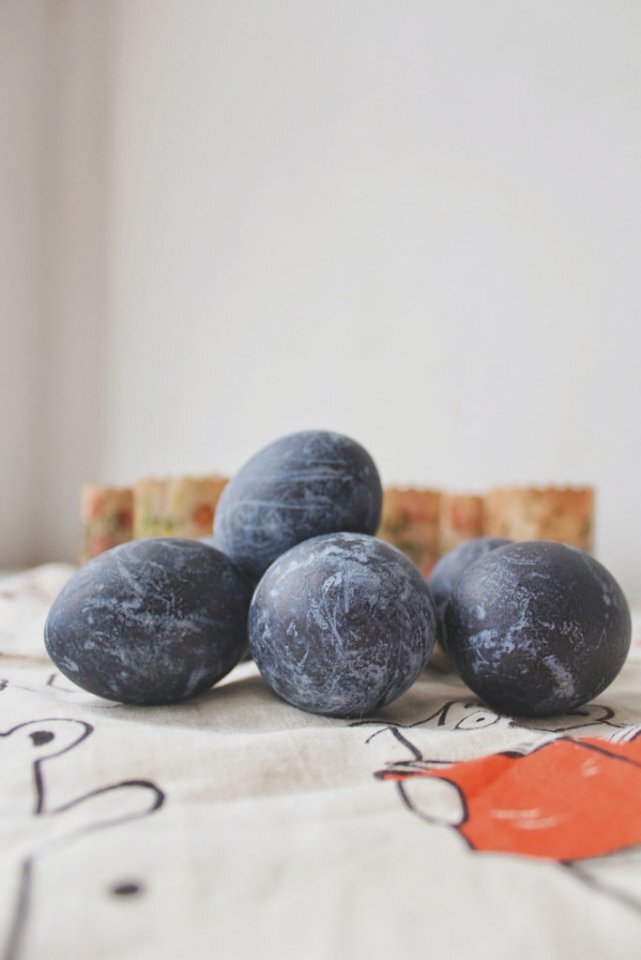 1.Для покраски яиц нужно взять целую упаковку чая каркаде (80 гр) и залить холодной водой в средней кастрюле. 2.Поставить на огонь, довести до кипения и варить 15 минут. 3.После этого окунуть отваренные в подсоленной воде яйца в раствор, укрыв их чайными листьями. Чем дольше вы держите яйца в растворе, тем более насыщенным получится цвет. Для результата как на фото ниже нужно оставить яйца на всю ночь в холодильнике. 4.На следующий день просто достаньте яйца и промокните бумажной салфеткой. Оставьте сушиться.