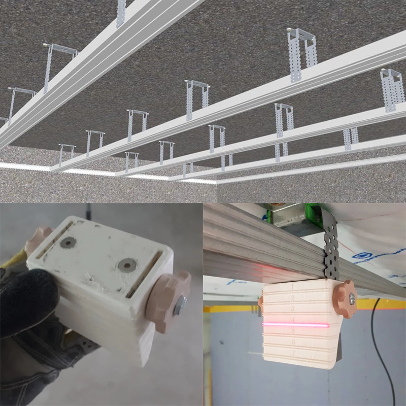 В современном ремонте используется два основных материала для отделки потолка: натяжное полотно и гипсокартон. Мы не советуем использовать гипсокартон, так как это усложняет обслуживание элетрики, находящийся над ним. Но этот подход к отделке потолка все равно пользуется популярностью, и мы не можем не рассказать о приспособлении, которое сильно упрощает выравнивание направляющих для листов ГКЛ. Классический способ монтажа потолка из гипсокартона подразумевает использование потолочных направляющих, которые закрепляются к потолку с помощью подвесов из металлической ленты. Далее монтируются поперечный профиль и уже крепятся сами листы. Но самый важный этап самый первый, ведь если направляющие будут не в едином уровне, то потолок получится кривой. Для решения задачи выравнивания направляющих максимально комфортно существует специальное приспособление. Оно представляет собой пластиковый корпус с разметкой, в который встроены магниты и боковые зажимы. Порядок использования этого приспособ
