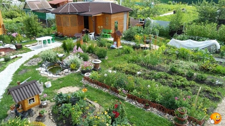 Большая часть земельного надела отводится под сад и огород, а вся остальная территория, свободная от технических сооружений, может быть занята местами отдыха, окруженными цветниками и деталями декоративного ландшафта.