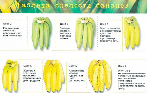 При выборе бананов нужно обращать внимания на плотные плоды, без повреждений и тёмных пятен на кожуре. Если бананы жёлтые, то хвостик в идеале должен быть чуть зеленоватым, а не тёмным. Недозрелые бананы станут сладкими, если их хранить при комнатной температуре в тёмном месте несколько дней. Спелые бананы хранятся не в холодильнике, где сразу начинают темнеть, идеальная температура – +15 °С.