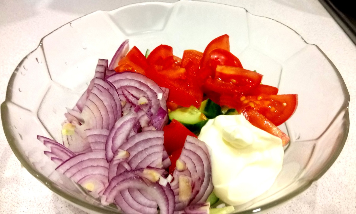 Доброго времени суток мои подписчики и читатели! Сегодня я хочу с Вами поделиться простым рецептом салата, который готовится из подручных продуктов. Готовлю его каждый день и заметила, что моё пищеварение значительно улучшилось! Нам понадобятся! помидоры - 2 шт; свежие огурцы (либо соленые) - 1 шт; красный лук - 1 шт; сметана или оливковое масло- 1 ст.л; чеснок - 1 шт; соль/черный молотый перец - по вкусу укроп/петрушка - по вкусу. Готовим! Огурцы и помидоры хорошо промываем и просушиваем. Лук с чесноком очищаем. В глубокую салатницу выкладываем нарезанные помидоры, огурцы и также добавляем лук, предварительно нарезанный полукольцами. Заправляем наш салат сметаной (можно заменить оливковым маслом), выдавливаем зубчик чеснока, солим и перемешиваем. При желании добавить укроп, петрушку или кинзу. Наш салатик готов! Этот овощной салат будет хорошим дополнением к вашему обеду или к вечернему ужину! Приятного аппетита!!!)))) Будьте здоровы!))) Ставь лайк👍 и подписывайся на мой канал, что