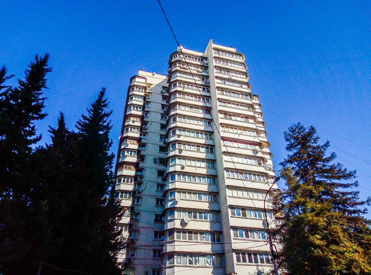 Во время моего февральского путешествия в Сочи, решил я немного прогуляться по Центральному Сочи. А для прогулок выбрал район города, который называется Ареда. До него от железнодорожного вокзала около 10 минут ходьбы. Ареда мне показалась типичным спальным районом города. В этом микрорайоне в основном преобладают многоэтажные высотки. Вот одна из них. И еще одна многоэтажка в Ареде. Обратите внимание, что деревья перед домом голые, без листьев. Несмотря на то, что Сочи находится в субтропиках, здесь также много деревьев, которые как и у нас на зиму сбрасывают листву. Есть в Ареде и обычные пятиэтажки. Вот например дом рядом с остановкой "Руставели". Здесь же находится сувлачная, где я впервые в жизни попробовал сочинский сувлак. Гуляя по Ареде, я увидел и вот такой пятиэтажный дом с детской площадкой. Самый обычный двор, такой же, как и во многих российских городах. Ну, разве что, пальмы растут прямо во дворе. А это - торговый комплекс "Ареда". Здесь же находится местный рынок. А это