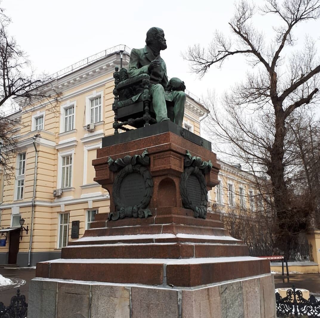 Памятник Николаю Ивановичу Пирогову на Большой Пироговской улице. Николай Иванович был выдающимся хирургом, ученым, профессором, основоположником военно-полевой хирургии и школы анестезии. В 1890-х годах хирургическое общество имени Пирогова решило создать памятник великому ученому, после чего последовал сбор средств. Но вот загвоздка - в те времена памятники ставили только царственным особам или полководцам! Естественно, монумент Пирогову сооружать запретили. Тогда в дело вмешался профессор Николай Склифосовский, который лично отправился в Петербург просить разрешения у Николая II. Итак, разрешение было получено, и скульптор Владимир Шервуд принялся за дело. Ученый представлен сидящим в кресле, в одной руке у него медицинский инструмент для обнаружения камней в почках, в другой череп. По бокам постамента памятные доски с фразами из трудов Николая Ивановича. Памятник был открыт 3 августа 1897 года, на торжественной церемонии присутствовали все профессора медицинского университе