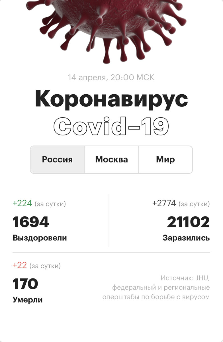 В России количество зараженных коронавирусом превысило 21 тыс. человек, в мире число инфицированных вплотную приблизилось к отметке 2 млн человек. Ситуация в России В России зафиксировано 21 102 случая заболевания (плюс 2774 за сутки). Всего в стране от коронавируса умерли 170 человек. Причиной роста числа заболевших коронавирусом в России могло стать массовое нарушение самоизоляции две недели назад, заявил главный внештатный эпидемиолог Минздрава, заведующий кафедрой эпидемиологии и доказательной медицины Первого МГМУ им. И.М. Сеченова Николай Брико. «Думаю, что да, в определенной мере это является свидетельством вот этих «шашлычных выходных», — сказал Брико. Вируc SARS-CoV-2 обладает в сотни и даже тысячи раз большей способностью заражать людей (вирулентность), чем вирус обычного сезонного гриппа, заявил главный внештатный эпидемиолог Минздрава Николай Брико. По мнению ученых, вирус может передаваться на расстояние до 4 м, пояснил он. Первые случаи смерти пациентов с коронавирусной