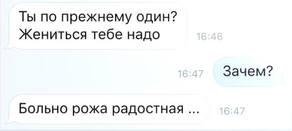 Седьмая часть угара подержите лайком! Жениться тебе надо Нашим бы такую зарплату Вдова миллионера Жень на моей сестре Я тоже себя люблю Бухачу Ничего не отвечай, так легче Сегодня мы будем готовить гуся Ты опять с пивом разговариваешь? Любимая позиция