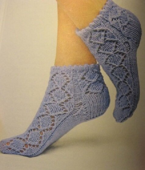 Вяжем ажурные носочки спицами Нам потребуется: 80 г. пряжи (50% шерсти 50% акрила), 100 г./300м. Комплект из 5 спиц; No2.5 Выполнение работы: На спицах набираем 48 петель и равномерно распределяем их на 4 спицах. Вяжем 6 рядов круговыми рядами лицевой гладью. 7 ряд вяжем две петли вместе лицевой, один накид повторяем до конца ряда с 8 по 12 ряды вяжем лицевой гладью. С 13 ряда продолжаем вязать ажурным узором по схеме Рапопорт повторяем по кругу четыре раза. Провязываем ажурным узором 12 рядов. 2. На петлях 1-й и 4-й спиц вывязываем пятку: вяжем прямыми и обратными рядами 14 рядов.Далее разделяем петли на три равные части и вяжем укороченными рядами. Затем поднимаем петли по боковым сторонам пятки, петли снова замыкаем в круг и вяжем основную часть.На петлях 2-ой и 3-й вяжем рельефно-ажурным узором, на петлях 1-й и 4-й спиц-лицевой гладью. 3.Вяжем длину основной части до мизинца, затем на петлях 2-й и 3-й спиц вяжем лицевой гладью и выполняем убавление для мыска.В каждом 2-м круговом
