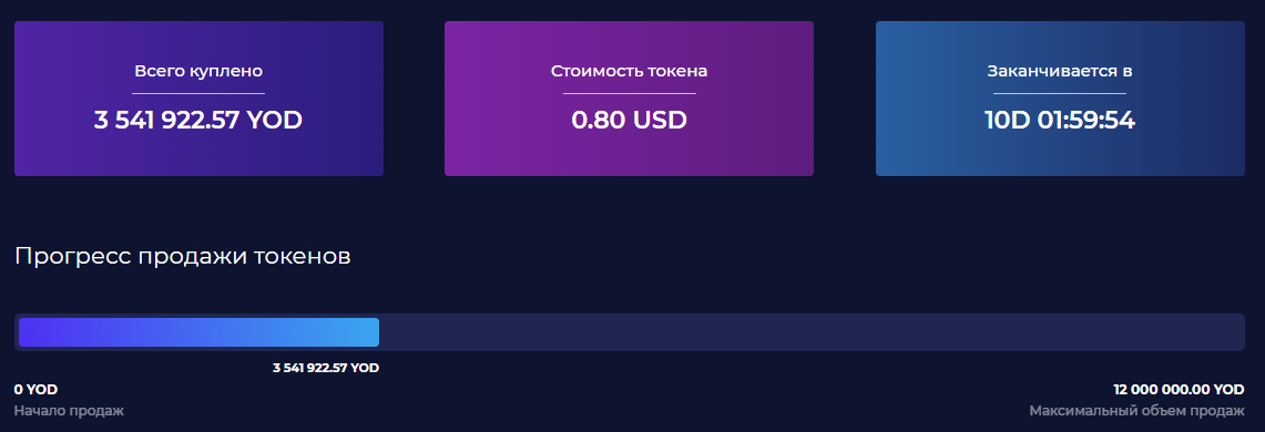Все, кто зарегистрировался в проекте и не приобрел токены Yod, более удачного времени не будет. Кто до сих пор не зарегистрировался, переходим по ссылке и регистрируем кабинет. Скоро увеличение стоимости токена с $0,8 до $1. А далее выход на биржи и будет уже рыночная цена, которую создатели YodaX обещали поддерживать не ниже $1. Если есть какие-то проблемы или что-то непонятно с покупкой пишите мне в личку или в телеграм @ @ Gruttt - помогу разобраться. Команда упорно работает над реализацией, как технической части, так и маркетинговой составляющей. Загляните в группу VK, там регулярно выкладываются новости, а так же выкладывают интервью с создателями проекта. Часто проводятся видеоконференции в режиме реального времени, в которых вы сами можете принять участие. Проект абсолютно открыт и прозрачен. На сегодняшний день продано уже 3 541 922 Yod. Продажи идут отлично, не смотря на общий спад рынка. В нынешних реалиях это весьма хороший показатель. Обращаю внимание, что сразу после оконч