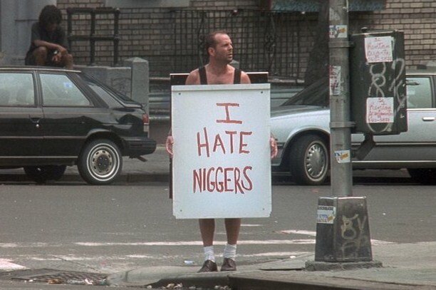 Представьте, что приезжает Брюс Уиллис в черный квартал Нью-Йорка Гарлем, наносит непоправимые оскорбления афро-американским пацанам и ему ничего после этого не было. Один против всех. Но так бывает только в кино. Когда в 1996 году я впервые посмотрел боевик "Крепкий орешек 3", мне особенно запомнилась сцена, в которой герой Брюса Уиллиса, Джон МакКлейн, по указке главного злодея Саймона приехал в район Гарлем. Этот место всем жителям Нью-Йорка, да и любителям американского кино и рэпа известно своей криминогенной напряженностью - именно там живут свирепые черные ребята, которые чуть ли не поголовно состоят в каких-либо бандах. Персонаж Уиллиса по приказу Саймона надевает на себя сендвич-плакат, на котором красуется надпись, в которой он, мягко говоря, очень не толерантно отзывается об афро-американцах из черного квартала. Не буду дословно цитировать фразу во избежании наложения ограничений на данный текст. Просто заменим одно слово на плакате и пусть на нем будет написано: Я ненавижу