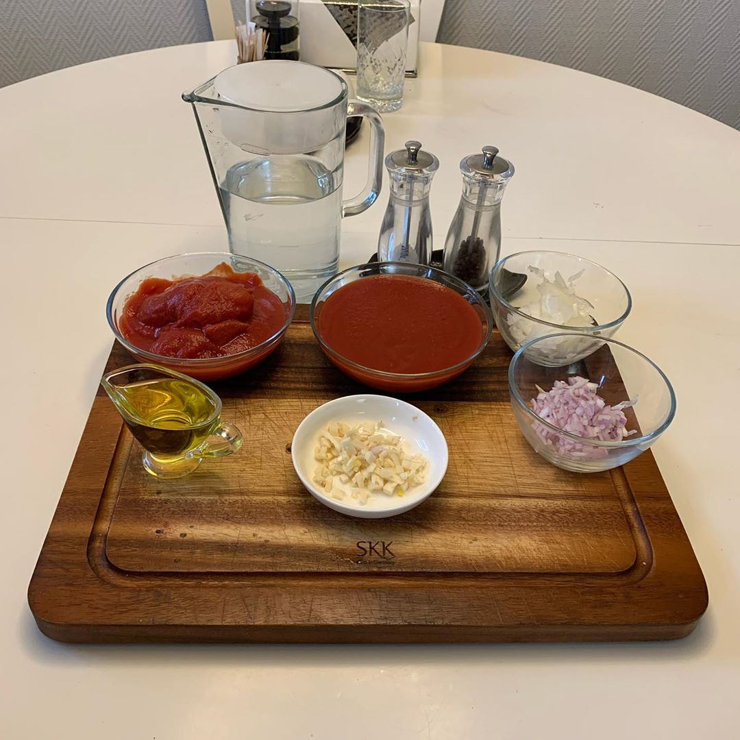 1. Начинаем с соуса. На медленном огне в 1 ст.л. оливкового масла обжариваем измельчённые 1 репчатый лук (3-4 мин.), 1 лук шалот (2-3 мин.) и 3 зубчика чеснока (ещё 3 мин.).