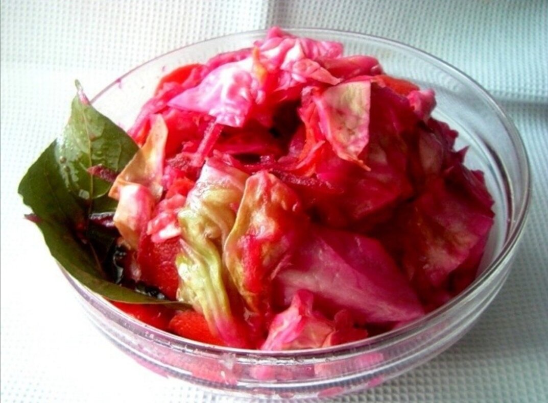 Ингредиенты на 1 банку: Капуста 2кг Свекла 1 шт 1 гол. чеснока лавр. листа 10 шт перец горошком Маринад: 1 литр воды 2 ст. ложки соли 150 грамм сахара 150 грамм уксуса (9%) 3 ст ложки подсолнечного масла Режем все ингредиенты, укладываем слоями в банку. Маринад кипяти 5 минут и заливаем ингредиенты в банке. Оставляем на 24 часа при комнатной температуре. Спустя 24 часа убираем в холодильник. Приятного аппетита