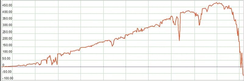 При агрессивной торговле можно увидеть удвоение изначальной суммы буквально через пару недель, но и риск неимоверно возрастает. Так или иначе, все подобные стратегии приводят к появлению паттерна “кочерга” в стейтменте: