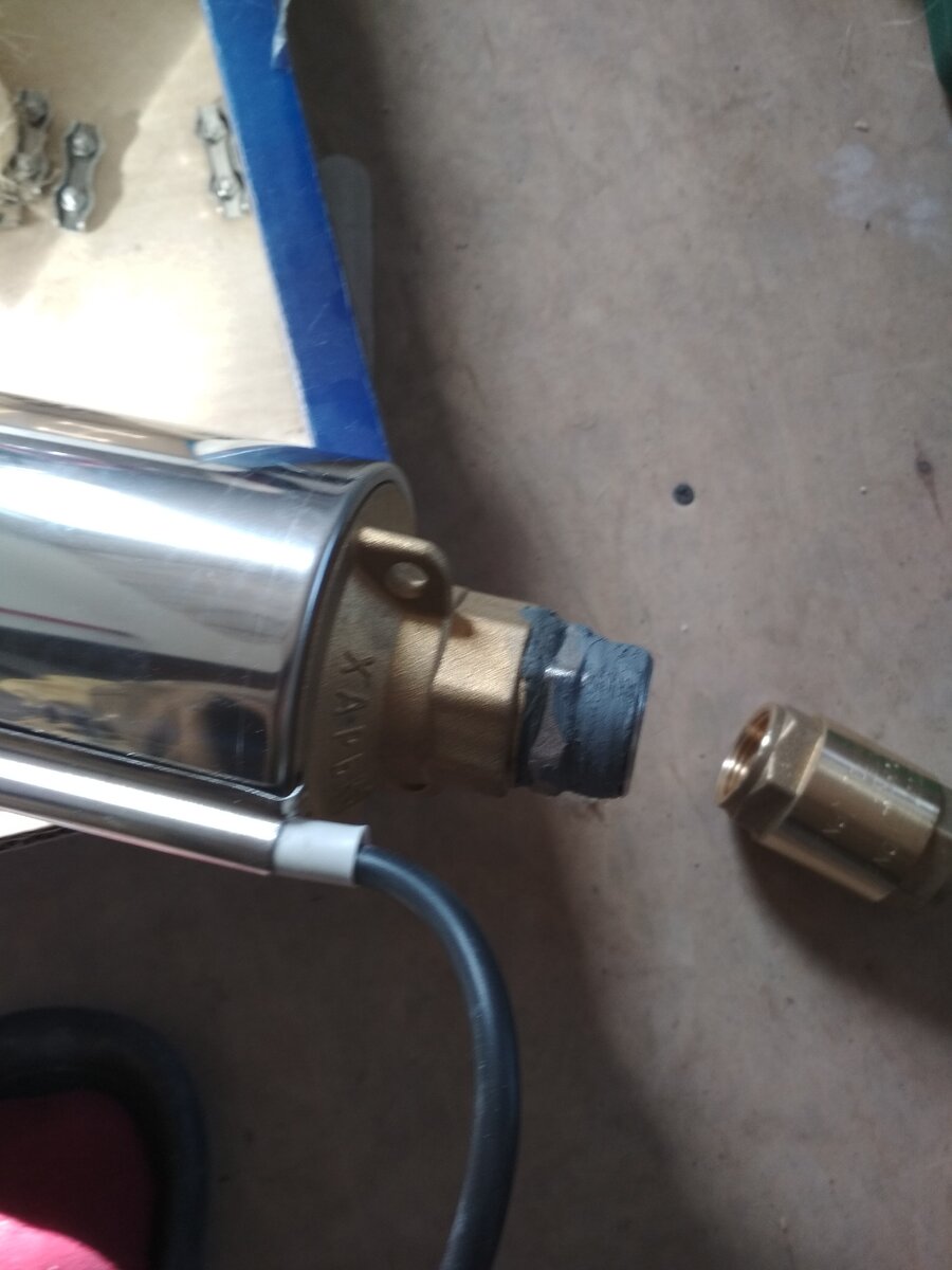 Всем привет. На днях занимался установкой скважинного насоса, о последовательности, нюансах и о том как собрать комплект и без проблем установить его в скважину. Сначала повесил насос на 20 метров, за 10 минут вода заканчивалась. Купил новую трубу и трос перевешал на 26 метров, решил все сфотографировать для общественности. В качестве насоса используем "Водолей", в отдельной статье расскажу, как отличить оригинал от подделки. 1) Берем насос и вкручиваем в него переходной ниппель 2) Далее вкручиваем обратный клапан, не забываем посмотреть на стрелку, которая указывает направление воды. Лучше брать латунный клапан с металлической пластиной. 3) Для монтажа использую лен+паста 4) Вкручиваем переходной фитинг в обратный клапан, не забываем уплотнить резьбу льном. 5) Разбираем фитинг и надеваем в такой последовательности на трубу 6) Край трубы можно немного подрезать и смочить водой, чтобы лучше зашла в фитинг 7) Далее, крепим трос и кабель к трубе, я использовал стяжки, делаем небольшое про
