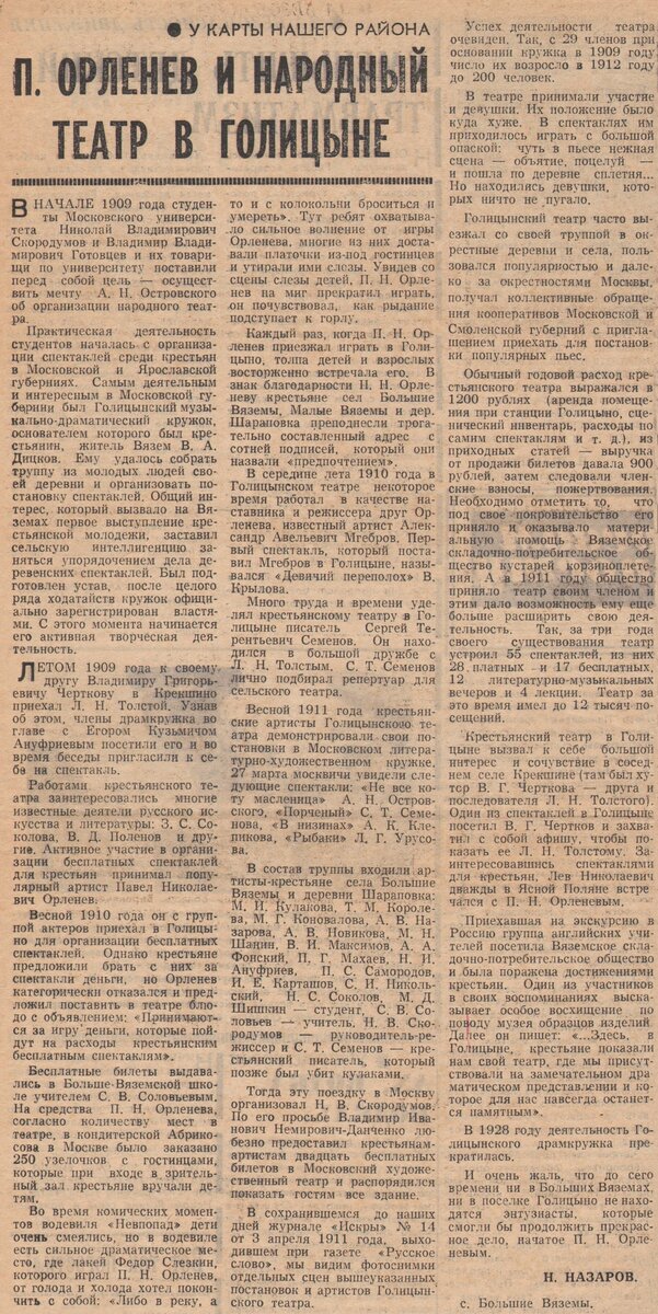 Прим. ред. — Архив журнала «ИСКРЫ», приложения в газете «Русское слово» за 1911 год, с публикацией о крестьянском театре в Звенигородском уезде, достаточно давно в нашем распоряжении, однако до некоторых пор не было ответа на вопрос о конкретном месте нахождения театра. Для выяснения этого требовалось найти в архивах хотя бы номер газеты «Русское слово», на который имеется ссылка в публикации журнала «Искры». Но всё разрешилось куда проще, стоило только обратиться к старым страницам районной газеты «Новые рубежи». В одном из номеров описана история Голицынского крестьянского театра, с которой мы спешим вас ознакомить. Л. ОРЛЕНЕВ И НАРОДНЫЙ ТЕАТР В ГОЛИЦЫНЕ В НАЧАЛЕ 1909 года студенты Московского университета Николай Владимирович Скородумов и Владимир Владимирович Готовцев и их товарищи по университету поставили перед собой цель — осуществить мечту А. Н. Островского об организации народного театра. Практическая деятельность студентов началась с организации спектаклей среди крес