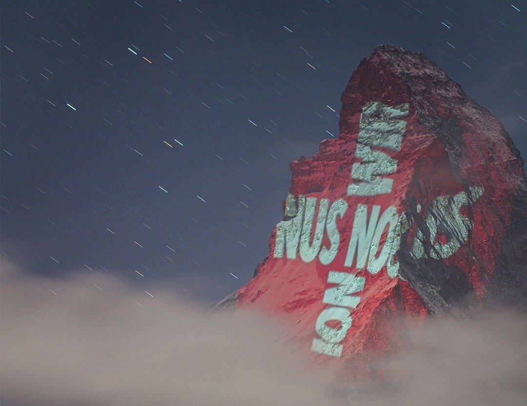 В Швейцарии на гору Маттерхорн (та самая с упаковки шоколада Toblerone) начали проецировать слова поддержки и флаги разных стран на время пандемии.