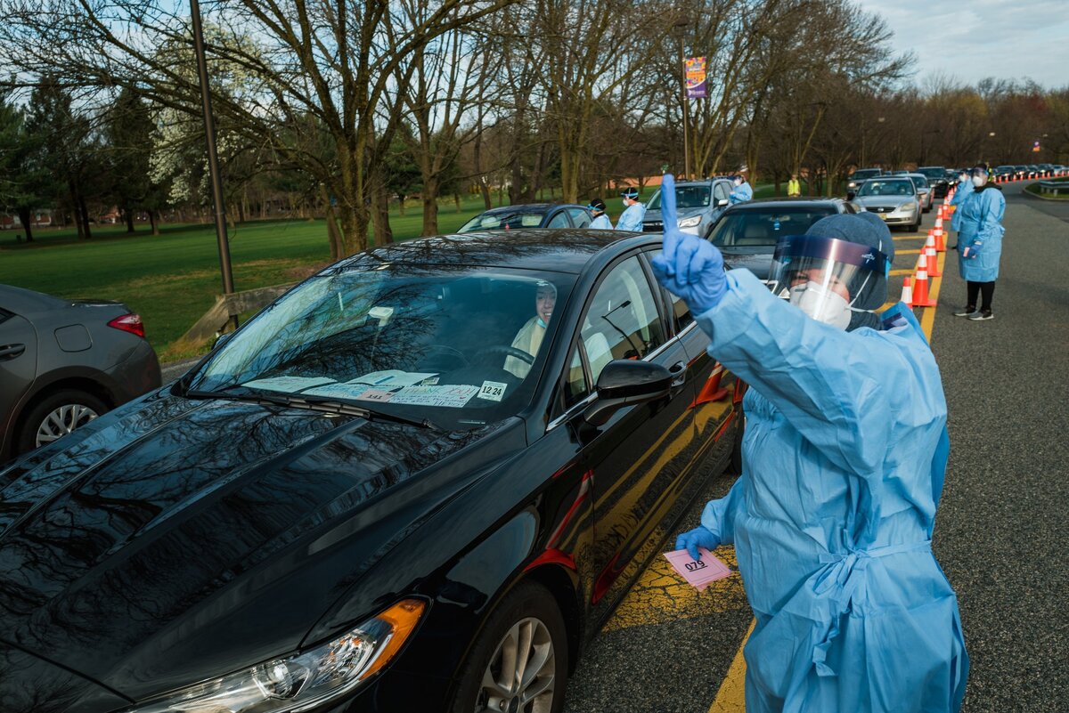 Медсестра в штате Нью-Джерси берёт мазок на коронавирус прямо в машине Пробирки в Quest Diagnostics, которая проводит большую часть скрининга на Covid-19. Лицевые щитки висят в палатке в Бергенском общественном колледже, месте для прохождения тестирования в Парамусе. Г-жа Массаротти проверяет у жителя симптомы Covid-19. Те, кто одобрен для теста, получают одну из 500 розовых карточек дня. Андрес Чиа, у которого был положительный результат теста на вирус, привел на обследование своего 84-летнего отца. Медицинские работники запечатывали образцы в мешки перед отправкой в лабораторию. Май Каррильо перебрал образцы на объекте Quest в Тетерборо, штат Нью-Джерси. Близость лаборатории к Нью-Йорку привела к затоплению. Лаборатория Тетерборо была перегружена, поэтому новые образцы были упакованы с сухим льдом для отправки в другое место. Джамал Картер загрузил образцы в фургон. Они скоро будут в воздухе. Джордж Фендли, пилот, готовился к полету в 270 милях к югу от Вирджинии