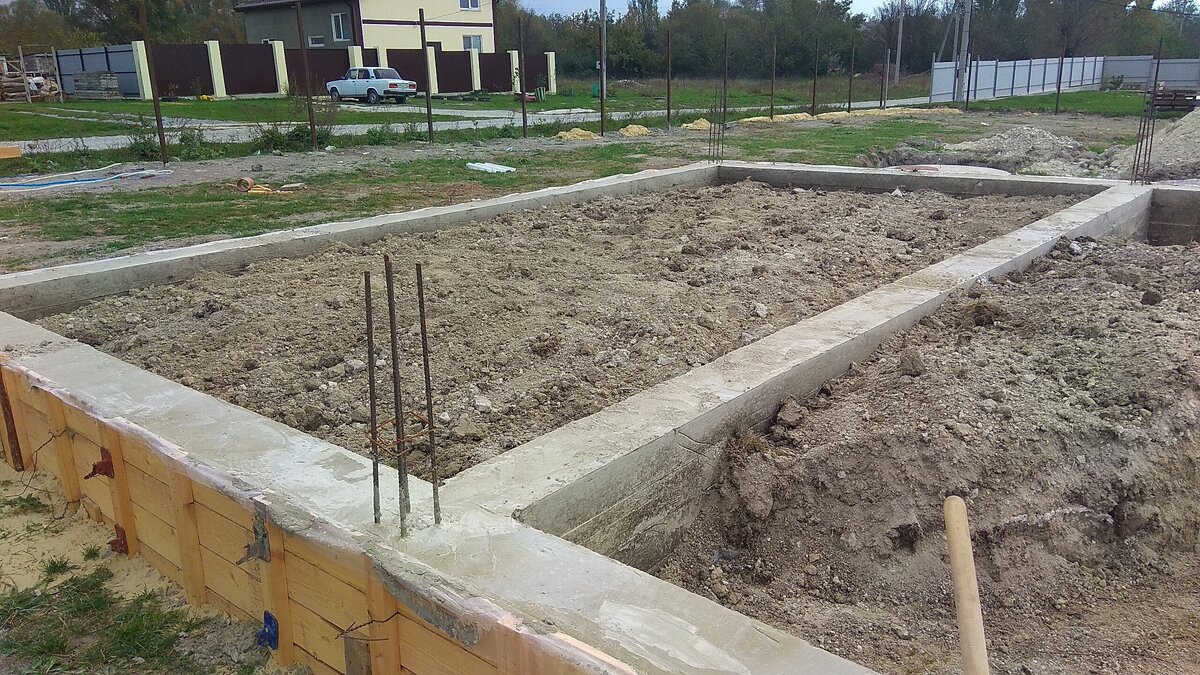 После того как лента была залита, я в течение 4 дней занимался забором о чём я напишу позже в отдельной статье. Затем пришло время снимать опалубку. Это дело оказалось не таким уж легким как я думал. Снимал щиты я только с внутренней стороны, с внешней стороны я их оставил для крепления к ней опалубки под плиту, об этом тоже позже. Очень громко крича и сильно ругаясь, я наконец-то справился с досками, конечно что-то пришлось сломать но в целом щиты были нормальные. Септик мы сделали простой: заказали 2 кольца ЖБИ по 2 метра в диаметре. Яму нам выкопал экскаватор после планировки. Потом приехал манипулятор, и поставил кольца на место. Так не хитро у нас появился септик. Сделали такой септик после разговора с соседями, как говорится "всё гениальное просто". Расположили септик так, как требует нормы: в 5 м от дома. Ещё до заливки подушки фундамента мы заложили гильзы под канализационные трубы и воду. Траншею от дома до септика нам выкопал эксковатор, который копал для фундамента.