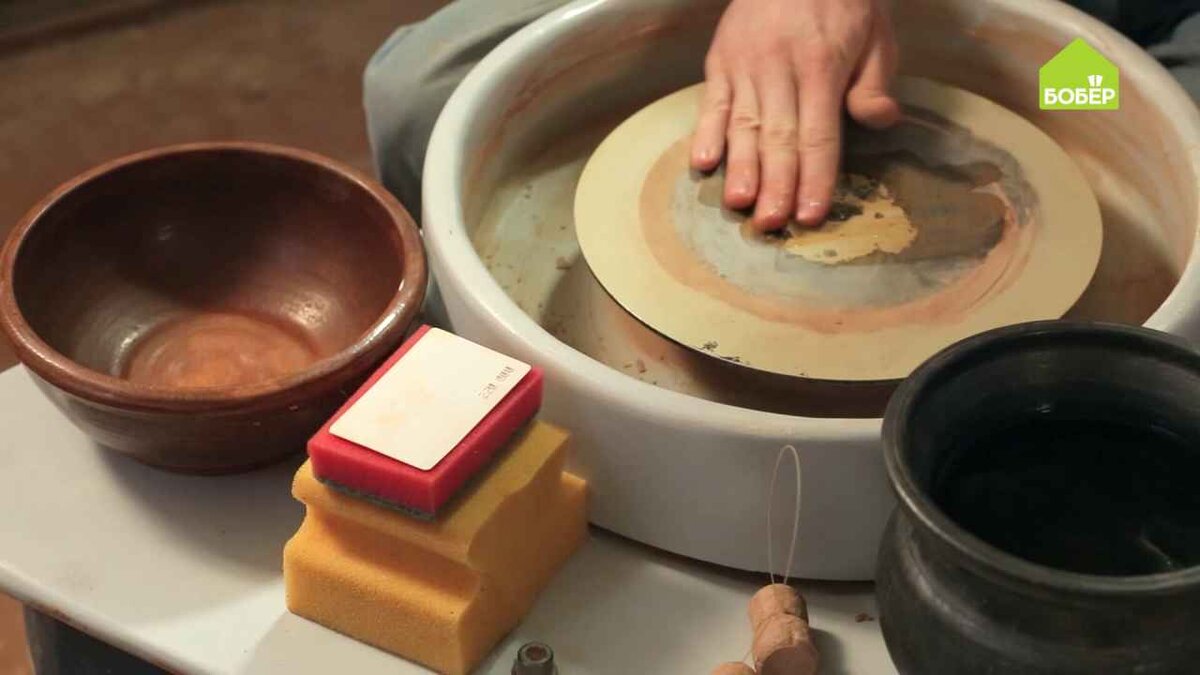Расскажем, что всегда должно быть под рукой во время работы на гончарном круге. Советы от гончара Ильи Калашникова. Разложите все рабочие инструменты гончара — ёмкость с водой, пустую ёмкость, разные типы и размеры губок и леску — вокруг гончарного круга и смочите его водой. В процессе создания небольшого горшочка мастер покажет, как всё это используется. Прижмите заготовку и включите гончарный круг. Во время работы для смачивания глины постоянно используется ёмкость с водой, которая должна находиться как можно ближе к гончару. Если на руках скопилась жидкая глина, сложите её в пустую ёмкость. Когда глина подсохнет, её можно снова использовать в работе или же применить в жидком виде для приклеивания ручек. Сделайте отверстие в будущем горшочке, положив излишки глины в пустую ёмкость. Через полторы — две недели эту глину можно будет использовать повторно. Когда цилиндр готов, вам понадобится маленькая губка, чтобы откачать воду из горшочка. Смочите губку, чтобы она размякла, и оп