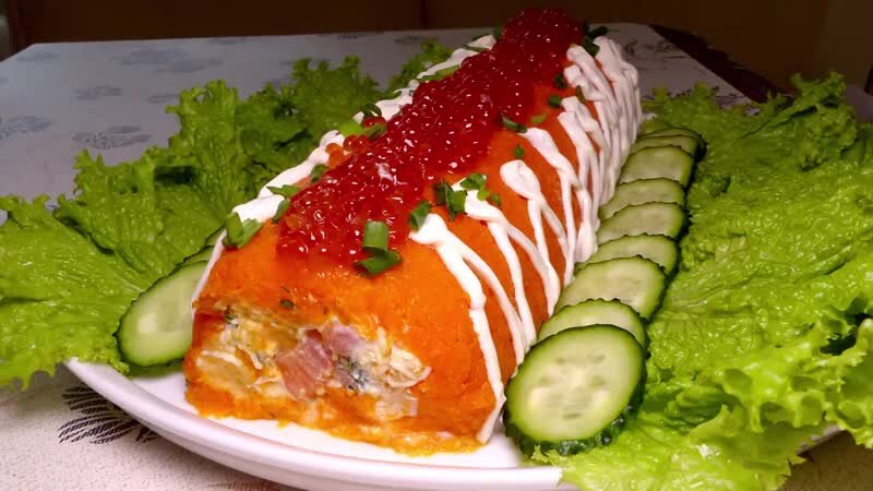 Рыба (форель или семга) — 200 Грамм (слабосоленая) Морковь — 3 Штуки Картофель — 2-3 Штук Яйцо — 3 Штуки Красная икра — 2 Ст. ложки Зелень — По вкусу Майонез — По вкусу 1. Подготовьте продукты: отварите овощи и яйца, остудите и очистите. Также понадобится плотная фольга для придания формы салату. 2. Очищенную морковь натрите на мелкой терке. На фольге разложите ровным слоем, смажьте майонезом, соль и перец по желанию. 3. Далее слой тертого картофеля, майонез, соль. 4. Слой тертых яиц, майонез, соль. 5. На одни край положите полосочками порезанную рыбу, посыпьте зеленью (укроп, лук подходит). 6. Осторожно, туго сверните салат в рулет. Фольга поможет придать форму, в таком виде уберите салат в холодильник на 5-6 часов минимум. 7. Спустя 6 часов салат осторожно разверните, переложите на блюдо с зеленью. Сверху полейте майонезом и положите по центру икру. 8. Салат можно сразу порезать порционно, а можно поставить на праздничный стол целым и подать нож и ложку.