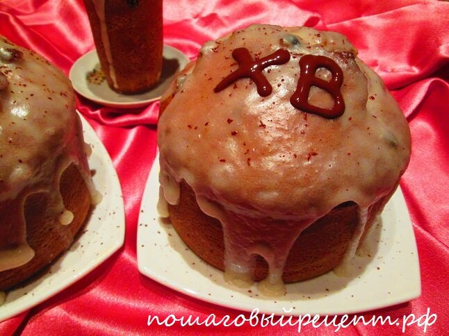 - Поставить в заранее разогретую до 180 С духовку, выпекать до готовности, готовность проверять деревянной шпажкой-если на ней нет теста, то кулич готов. Сверху куличи полить лимонной глазурью и украсить шоколадом. Светлой Пасхи!
