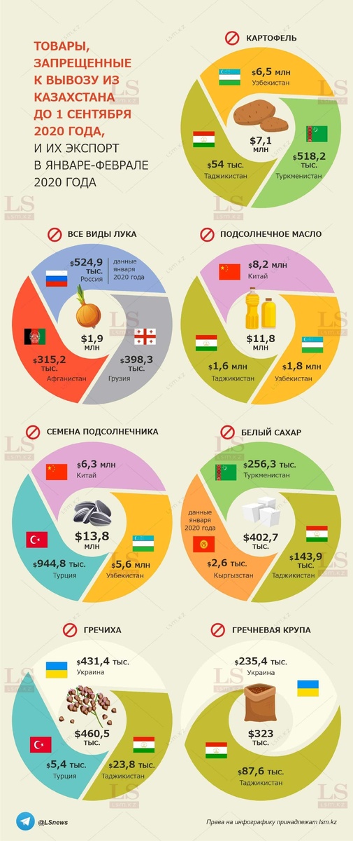 Министерство сельского хозяйства до 1 сентября запретило экспортировать ряд товаров из Казахстана. Мера нужна для бесперебойного обеспечения населения. По этому поводу LS представляет инфографику о том, в какие страны и в каком объеме были вывезены данные сельхозтовары в первые два месяца 2020 года. Барьер был поставлен для вывоза картофеля, всех видов лука, подсолнечного масла, семян подсолнечника, гречихи, гречневой крупы и белого сахара. За январь-февраль больше всего Казахстан выручил с продажи семян подсолнечника и подсолнечного масла. Главными покупателями оказались Китай и Узбекистан. Объем поставок картофеля превысил $7 млн, продукция продавалась преимущественно в Узбекистан. Экспорт всех видов лука составил $1,9 млн. Помимо этого, Казахстан продал белый сахар на $402,7 тыс., гречиху – на $460,5 тыс. и гречневую крупу – на $323 тыс. Ранее LS представлял инфографику об импорте кондитерских изделий в Казахстан. Другие инфографики Перепечатка материала и инфографики другими СМИ за