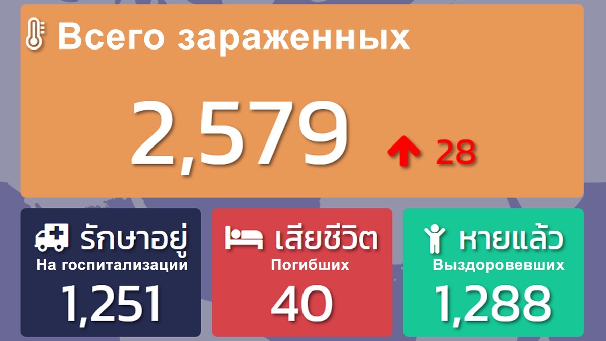 На утро 14 апреля 2020 года сейчас в Таиланде 2579 случаев заражения (28 новых случаев со вчерашнего дня). На данный момент зафиксированно 40 смертей от осложнений вызванных коронавирусной инфекцией COVID-19. Всего под наблюдением (проходят тесты и/или находятся в карантинной зоне) 34786 человек (на 976 больше со вчерашнего дня). Провинция Чонбури и город Паттайя уже второй день подряд не выявляют новых случаев заболевания. Похоже, что принятые меры с коменданстким часом действуют. Среди россиян ходит байка, что в Таиланде такое низкое количество больных из-за отсутствия тестовых систем. Это не верно. На данный момент в отеле Grand Bella (в Паттайе) проводится профилактическое выборочное тестирование людей без симптомов, но входящих в группу риска. Каждый день тест проходят не более 200 человек и пока нет никаких признаков COVID-19 среди местного населения. Всего зафиксирован 81 случай заболевания. *** Больше новостей о Таиланде читайте на нашем сайте: Новости Таиланда