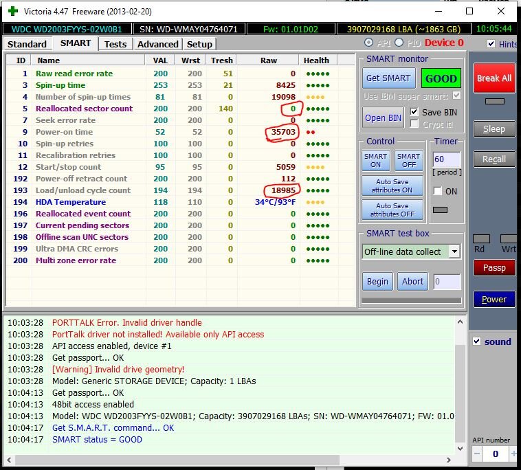 Начну я с объяснений что к чему. Во всех жестких дисках есть такой кусочек памяти, куда записываются важные моменты состояния их работы. Называется S.M.A.R.T. именно так, с точечками. Программ которые позволяют увидеть этот самый смарт десятки, как и параметров в нем, но параметров мы рассмотрим только три. Это важно для понимания. Вот пример работы двух из них: AIDA64 и Victoria, на примере диска WDC WD2003FYYS-02W0B1.