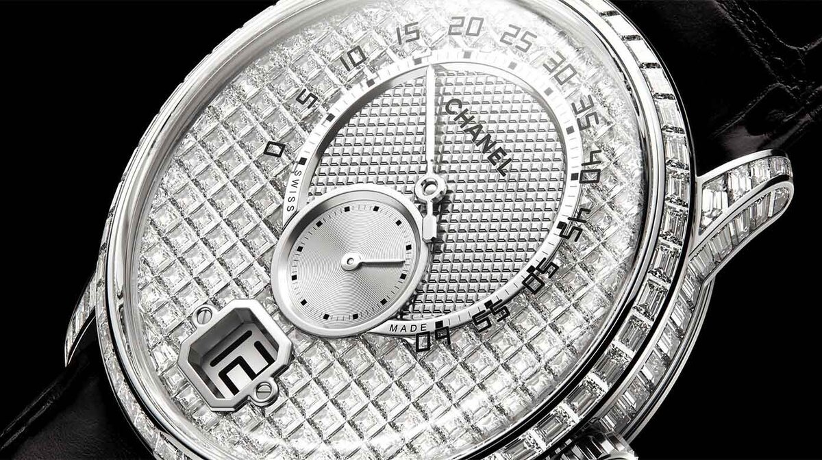 Когда бриллианты – лучшие друзья мужчин. Часовая коллекция Monsieur de Chanel, впервые представленная в 2016 году, была создана одновременно с первым собственным механизмом модного дома Chanel, который так и назвали – calibre 1. Автоматический механизм, оснащенный функцией прыгающего часа и ретроградной индикацией минут, установлен в часы, адресованные представителям мужского пола. Запас хода у механизма – 72 часа, что является самым высоким показателем в часовом направлении бренда Chanel. 2020 год для Chanel – синоним обновления и смелости. Использовав бежевое и белое золото, платину и керамику для создания корпуса, сталь и опаловое стекло для циферблатов, Chanel решила раздвинуть гендерные границы, чтобы предложить мужчинам то, что привычно ассоциировать с женщинами, а именно – бриллианты. Всего для декора лимитированной 20 экземплярами серии использовано 288 бриллиантов багетной огранки. Изготовленный из белого золота корпус диаметром 40 мм инкрустирован 66 камнями (~3,02 карата),