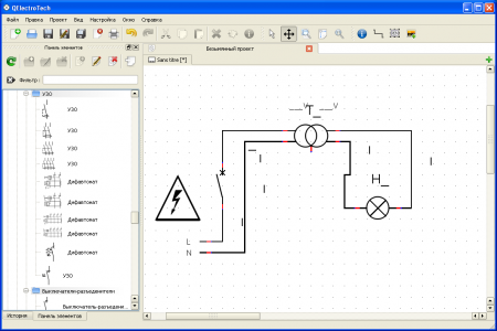 В данной программе имеется множество различных элементов для начертания электрических схем, таких как элементы логических схем, измерительных приборов так и высоковольтного оборудования.