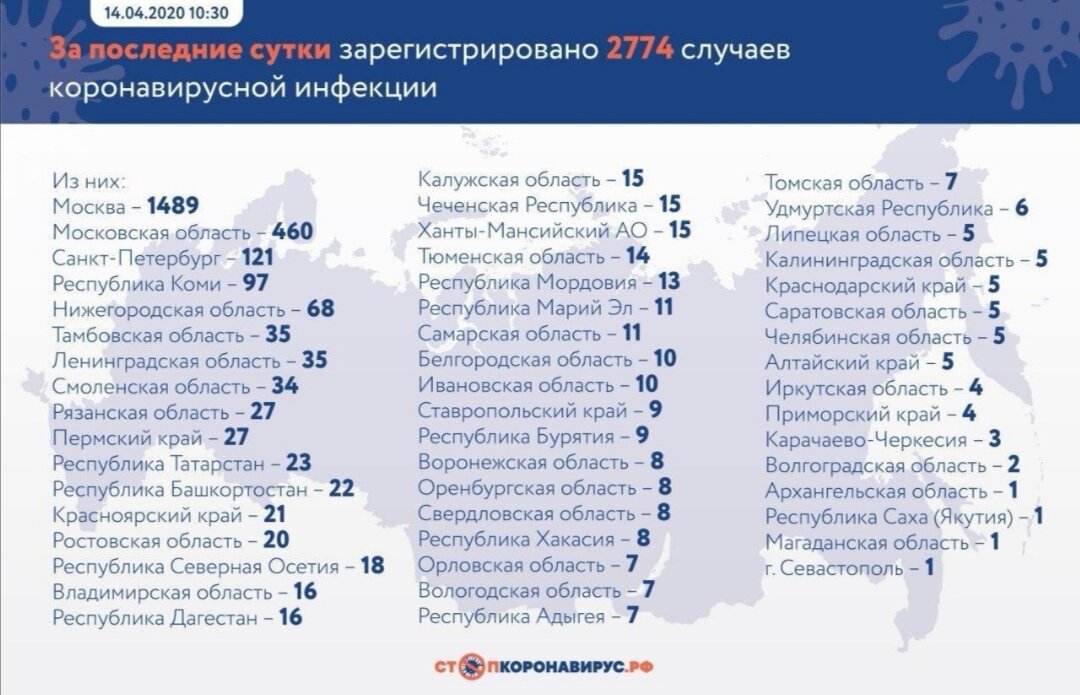 Всего за все время в России количество зараженых превисыло 21 тысячу человек, умершие за сутки 22 человека, новые случаи заражения 2774 в 82 регионах страны Погибшие и пострадавшие По данным Всемирной организации здравоохранения (ВОЗ) на 13 апреля, число зараженных коронавирусной инфекцией в мире превысило 1,773 млн человек. Согласно актуальным данным Университета Джонса Хопкинса, всего заразились уже свыше 1,9 млн человек, более 453 тыс. выздоровели. Ситуация в других странах У ученых пока недостаточно данных, чтобы ответить на вопрос о том, может ли переболевший COVID-19 человек вновь заразиться инфекцией. По словам ведущего специалиста ВОЗ по коронавирусу, исследование в Шанхае показало, что у части излечившихся отсутствовал ответ антител, хотя у других он был высоким. Другой вопрос, означает ли это наличие иммунитета, отметил эксперт. У ВОЗ нет никаких доказательств того, что противотуберкулезная вакцина БЦЖ может защитить от коронавируса. Сейчас проводятся два клинических испыт