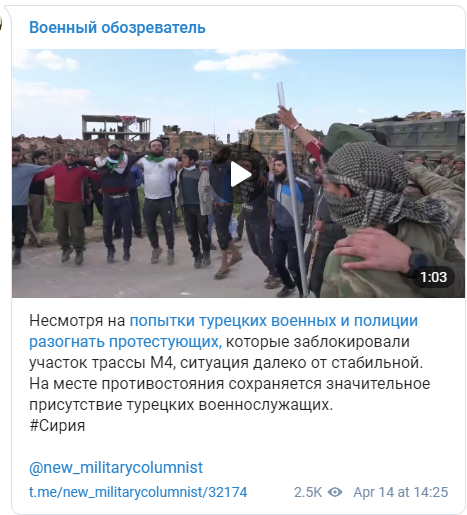 Жители сирийской провинции Идлиб заблокировали участок трассы М4, на которой патрулируют турецкие войска. Попытки турецких военных разогнать протестантов не увенчались удачей. На видео, распространенной каналом "Военный обозреватель" в Телеграме видно, как протестанты танцуют на магистрали. Напомним, что согласно мартовскому соглашению между Россией и Турцией в Идлибе была достигнута договорённость о прекращении огня. В рамках соглашения трасса М5 перешла под контроль сирийских войск. На трассе М4 была организована совместный патруль российских и турецких войск. Сирийцы, однако, с самого начал патрулирования протестуют против турецких войск. Ранее сирийцы сообщили, что турецкая полиция использует слезоточивый газ против жителей закрывших магистраль.