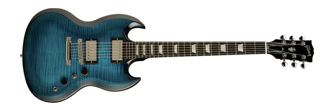Рогатый Gibson SG – тот самый инструмент, на котором запиливает свои сольные партии гитарист AC/DC Ангус Янг. Кроме формы корпуса, отличается от Les Paul ещё и тем, что дека SG производится из одной цельной доски красного дерева, а не склеивается из нескольких отдельных элементов. Собственно, и сами буквы SG расшифровываются как solid guitar (цельная гитара). Пуговица для ремня у этого инструмента располагается не на окончании «рога» корпуса, а с обратной стороны деки в верхней части.