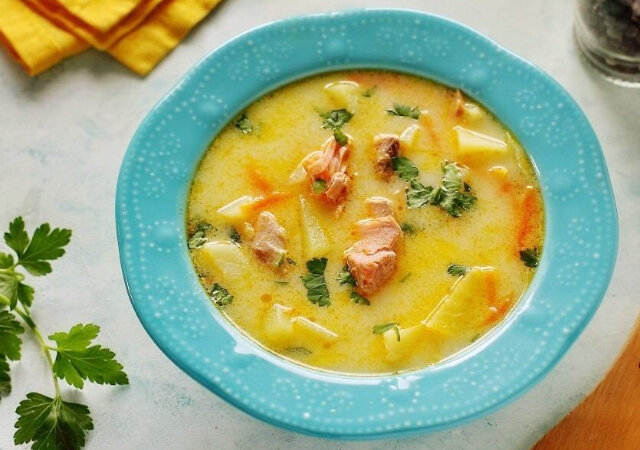 Ингредиенты: Горбуша, обрезь — 400 г Картофель — 4–5 шт. Сыр плавленый — 180 г Лук — 1 шт. Морковь — 1 шт. Растительное масло — 3 ст. л. Лавровый лист — по вкусу Перец горошком — по вкусу Соль — по вкусу Приготовление: 1. Рыбу промойте и сложите в кастрюлю. Если вы будете использовать голову, то предварительно удалите жабры. Добавьте воду, лавровый лист, перец горошком и варите после закипания на небольшом огне 15–20 минут. В момент закипания не забудьте убрать образовавшуюся пенку. 2. Картофель очистите и нарежьте кубиками. 3. Лук нарежьте кубиками, морковь натрите на терке. Обжарьте овощи на растительном масле до мягкости. 4. Готовый бульон процедите. Рыбу отделите от костей и уберите пока в сторону. 5. Добавьте в бульон картофель, соль по вкусу и овощную зажарку. Поставьте на плиту и варите до полной готовности картофеля. 6. В самом конце добавьте плавленый сыр, рыбу и рубленую свежую зелень. Дайте супу покипеть пару минут, затем накрыв крышкой снимите.