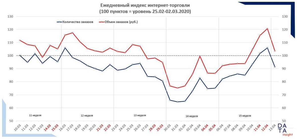Мы ежедневно собираем данные с крупнейших интернет-магазинов (более 60% всех заказов в Рунете) и высчитываем индекс, как динамику заказов интернет-магазинов от "нулевой" недели (7 дней от 25 февраля) .
