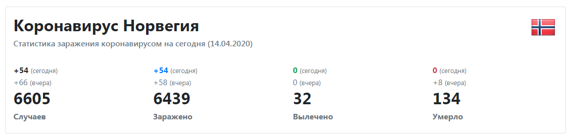 По состоянию на 14 Апреля 2020 года общее количество заболевших коронавирусом в Норвегии составило 6551 человек.
