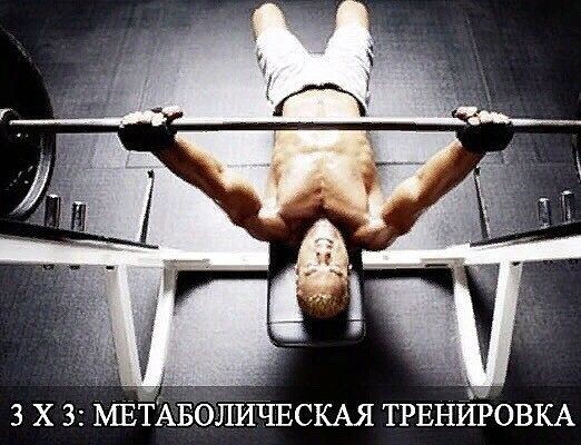 Как правило, тренеры заставляют своих учеников тренировать силу отдельно от тренировок, направленных на поддержание общей физической формы. Однако, многие виды спорта требуют от атлетов работы в смешанном режиме - где от них требуется проявление не только изрядной силы, но и хорошей сердечно-сосудистой или аэробной выносливости. Метаболическая тренировка - это, в сущности, комбинация силовой тренировки с аэробной. К сожалению, тренеры не уделяют достаточного внимания состоянии метаболической системы атлета. Метаболическую форму можно улучшить просто путём выполнения силовых упражнений с очень короткими паузами отдыха между ними. Если тренировка проводится именно в такой манере, то она предъявляет к мышечной и сердечно-сосудистой системам атлета такие требования, которые, в их совокупности, и приводят к тому метаболическому эффекту, получить который с помощью других традиционных методов тренинга невозможно. Тренировка "3 х 3" Схема "3 на 3" имеет много вариантов. Их число безгранич