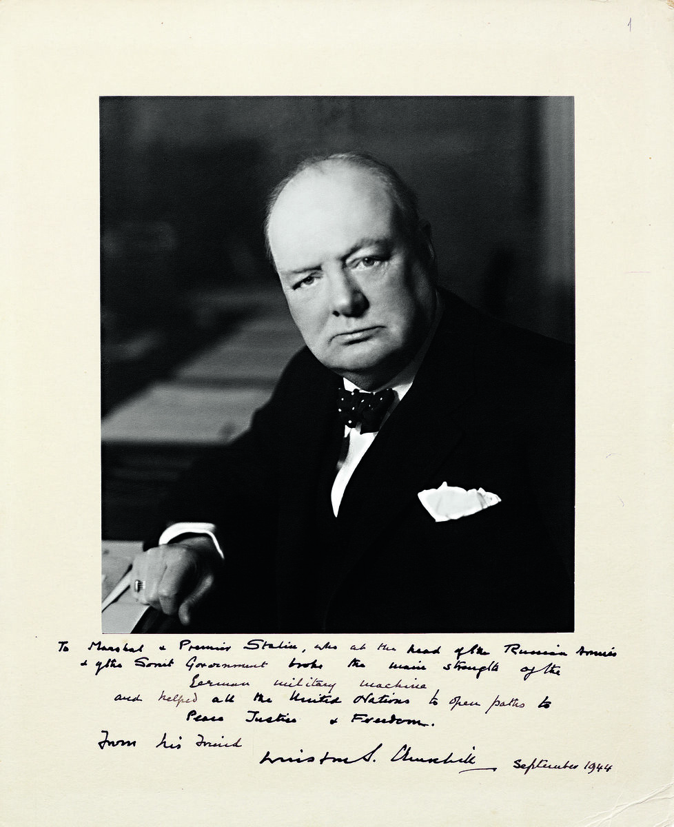 «Сила советского правительства, стойкость русского народа, его неисчислимые резервы людской силы, необозримые просторы страны, суровость русской зимы — вот факторы, в конце концов погубившие армии Гитлера. Но ни один из этих факторов еще не проявился в 1941 году. Президент Рузвельт за-явил в сентябре 1941 года, что русский фронт удержится и что Москва не будет взята. Это его заявление было тогда сочтено слишком смелым; однако чудесная сила и патриотизм русского народа оправдали его предсказание» У. Черчилль. На фото: Премьер-министр Великобритании У. Черчилль 30 октября 1944 Дарственная надпись (перевод с английского языка): Маршалу и премьеру Сталину, который во главе русской армии и советского правительства свергнул немецкую военную машину и помог всем Объединенным Нациям открыть дорогу к миру, справедливости и свободе. От друга Уинстона Черчилля Сентябрь 1944 РГАСПИ
